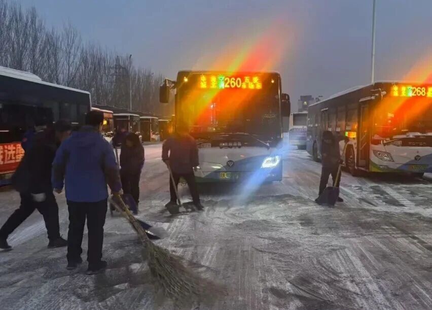 天色未亮,各車(chē)隊(duì)的管理人員與駕駛員已提前到崗。他們手持除雪鏟、掃帚等工具,默契配合,全力清掃公交場(chǎng)區(qū)、車(chē)輛及站臺(tái)積雪,為公交車(chē)輛安全進(jìn)出場(chǎng)、乘客安全候車(chē)掃清障礙。在確保場(chǎng)站暢通的同時(shí),出車(chē)前的安全叮囑準(zhǔn)時(shí)在各車(chē)隊(duì)響起:“注意觀察路況,控制車(chē)速,保持車(chē)距……”一句句樸實(shí)而鄭重的提醒,凝聚著公交人對(duì)安全行車(chē)的高度重視和對(duì)乘客的深切責(zé)任。
